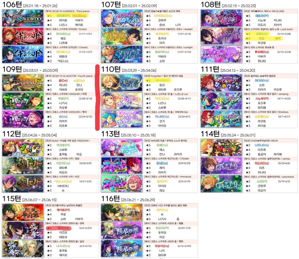 1. 노란색은 명함 빨간색은 풀돌 목표고 에이치 하코 전 세로줄은 복코투어 예정이라 체크해 둔 것…… 뭐지 왜 빡세지? 소과금러 목표 주제에 풀돌 따위 생각해선 안 됐는데
